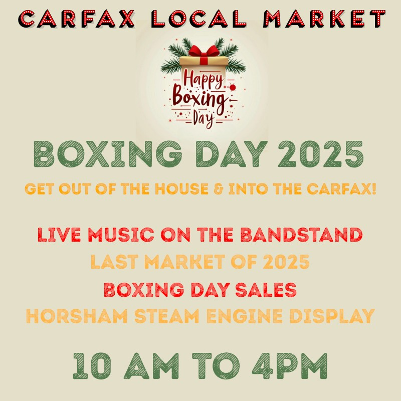 The Searle Group will be bringing their popular traction engines through Horsham Town Centre on Boxing Day, arriving around 1.30–2.00pm* and stopping in the Carfax for approximately one hour. Also the lovely FoodRocks team have arranged for market stalls and music in the Carfax to support your boxing day browsing and shopping needs!